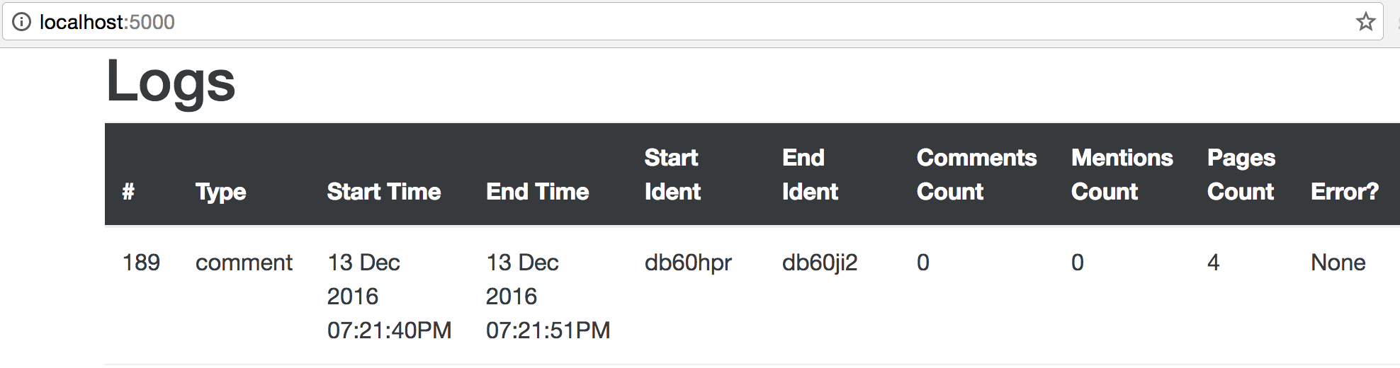 The actual code that does the work (the functions run_gather_comments and run_gather_threads) can live anywhere, even in the clock.py file. But since all these files have nice, short, one word names, I put that code in run.py file, which loads the scraper object from a different file, to keep all the logic separate. I’m won’t go over the scraping here since that’s a different topic.