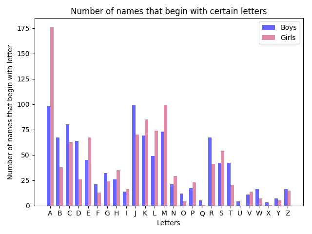 Most boy names begin with J where A is close behind, but girl names that begin with A crush boy A names. Everything else seems matching.
