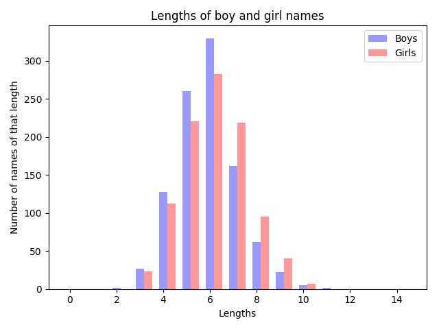 In this case for this post, you’ll see that the average and standard deviation of the lengths of boy’s names are both smaller than girl names, I can come up with an explanation about how parents think girls are more unique than boys and having more diverse names will show that. If those numbers were flipped, an explanation could be how girls names that used to be short names for longer ones have the real name where boys still keep the formal version.