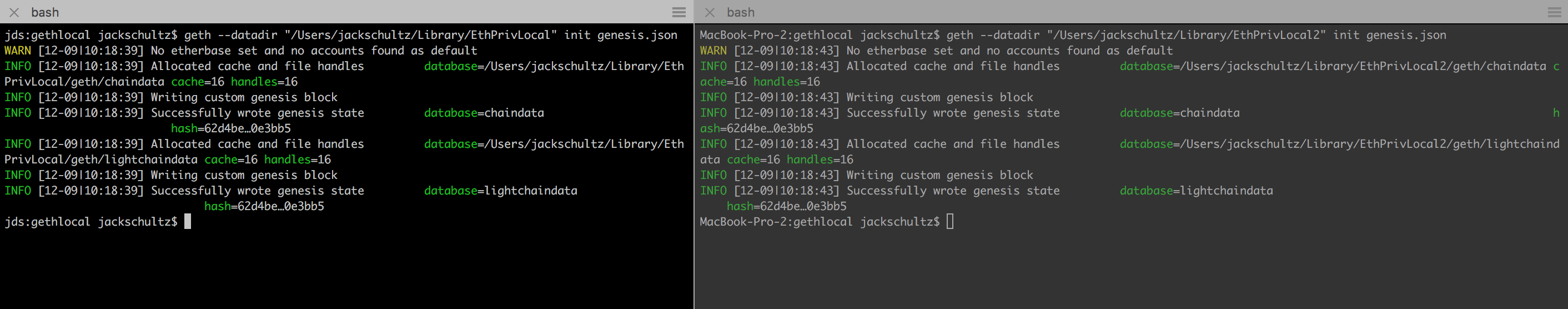 So far, we’ve done three things. 1) Created a genesis.json file in a working directory of your choosing, 2) picked a directory to store the blockchain for one node and initialized the first block, and 3) picked a different directory to store the blockchain for the other node. Very little code and a few commands.